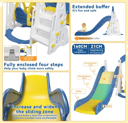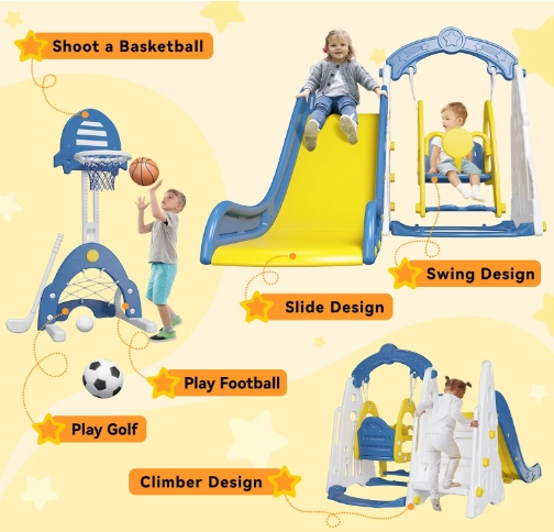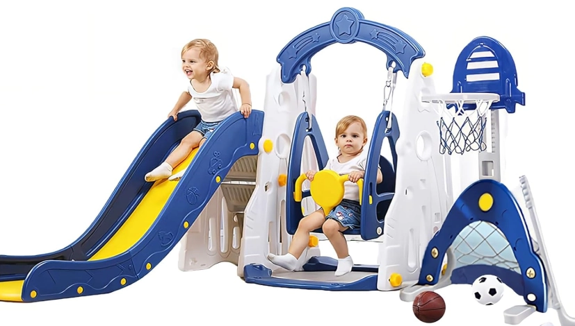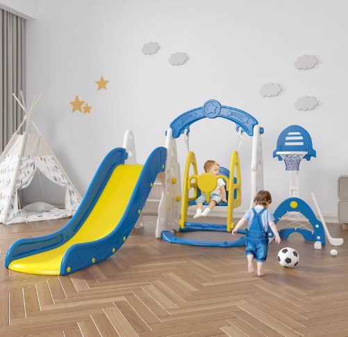 ملعب أحلى للوناسة والمتعة، فيه زحليقة ناعمة ومرجيحة آمنة للأطفال، بعد فيه سلة كرة صغيرة وألعاب رياضية بسيطة مثل كرة القدم والهوكي. تصميمه مرتب وسهل التركيب يناسب غرف الألعاب أو الحوش.