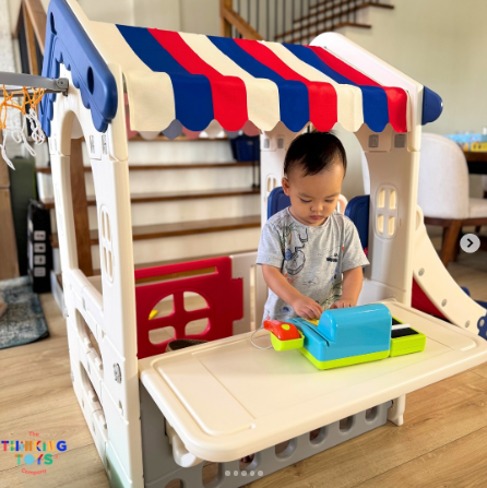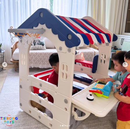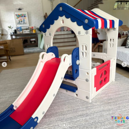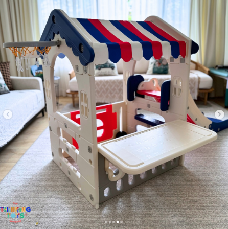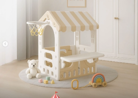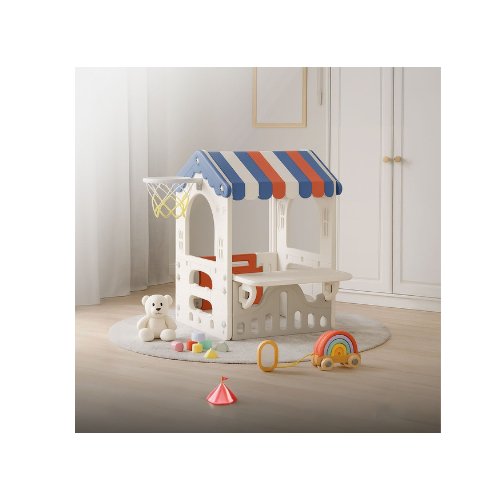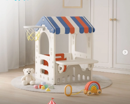 عطِ عيالچ بيت ألعاب فخم، مع سطح ملون وألعاب يقدرون يلعبون بيها. مو بس بيت، لا بعد فيه ملعب كرة سلة صغير حتى يلعبون ويمرحون. مصنوع من خامات متينة وآمنة للأطفال، وتصميمه يناسب أي ركن في بيتكم.